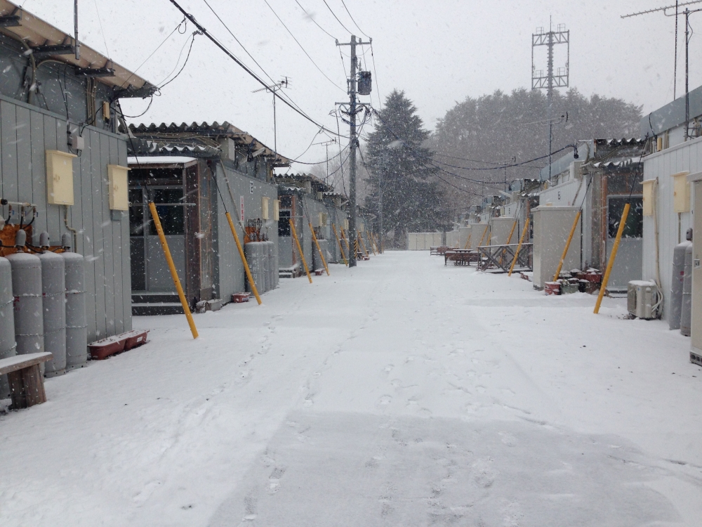 夕方からは雪がひどくなってきて、仮設住宅も雪が積もってきました。