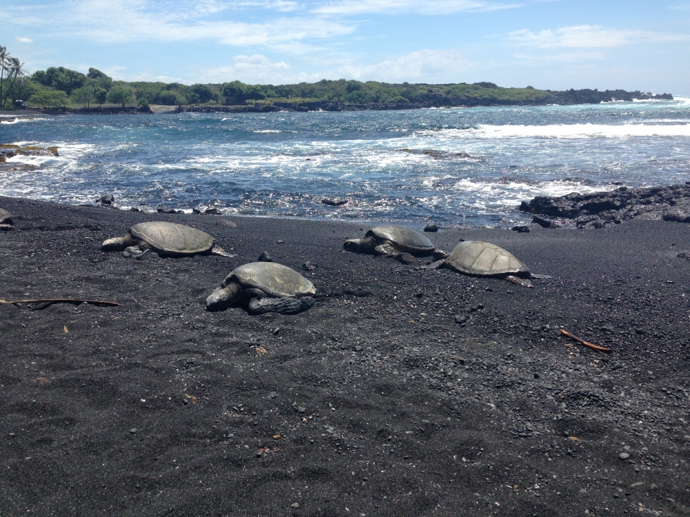 黒い火山灰でできた砂浜にはアオウミガメがいてました。